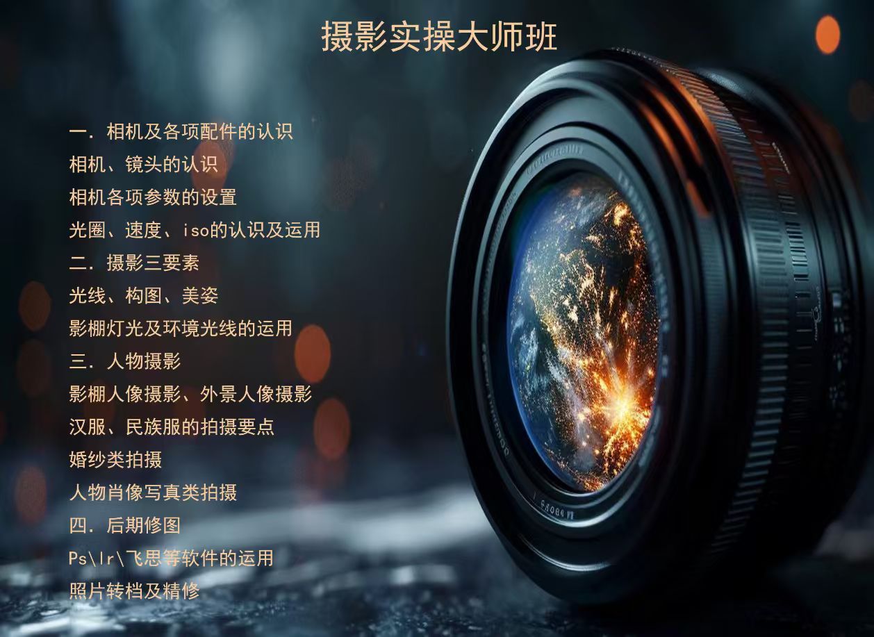 课程简介:摄影实操大师班学期:一个月1,相机发展史,2,摄影基础知识(光圈,快门,感光度,白平衡,曝光控制,传统相机与数码相机成像原理。相机选购及保养,摄影附近)。3,构...