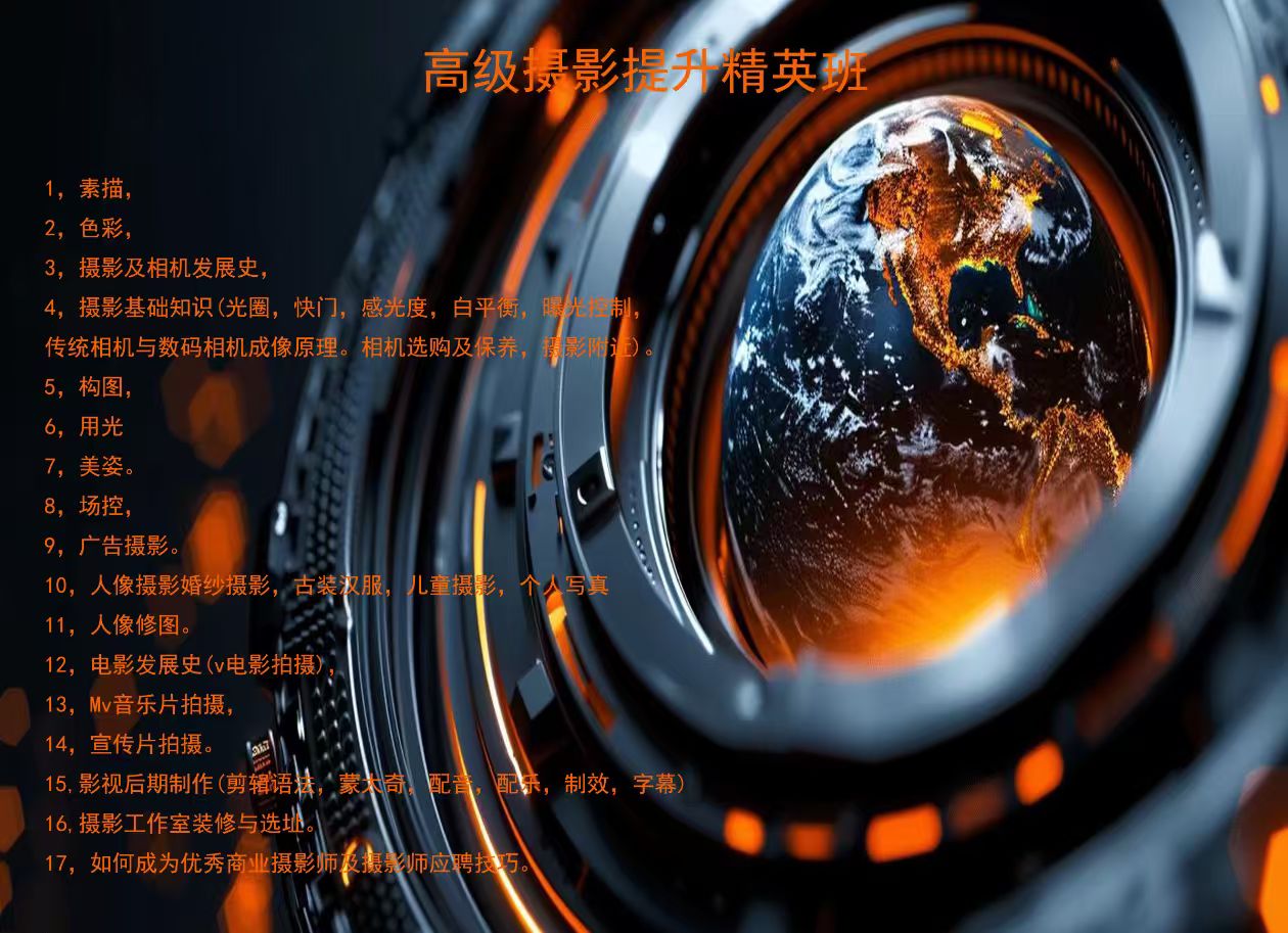课程简介:高级摄影提升精英班学期:两个月1,素描,2,色彩,3,摄影及相机发展史,4,摄影基础知识(光圈,快门,感光度,白平衡,曝光控制,传统相机与数码相机成像原理。相机...